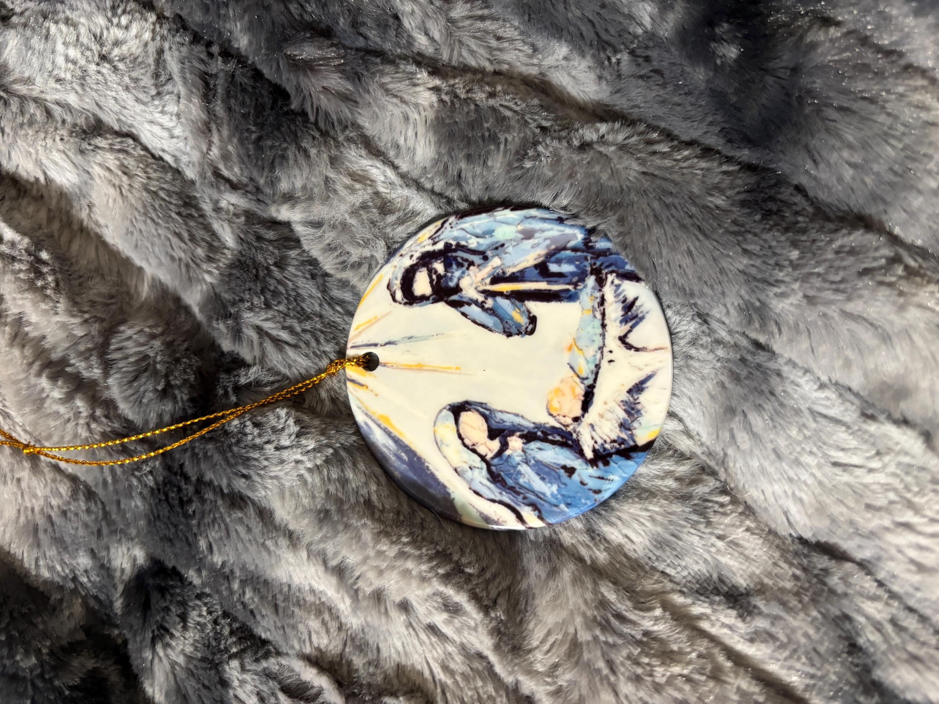 Celebrate the heart of Christmas with this beautiful Nativity ornament featuring Mary, Joseph, and Baby Jesus. The artwork is a high-quality sublimated print created from an original Stacie Kearns Art painting, capturing every soft, expressive detail on a durable ceramic ornament.