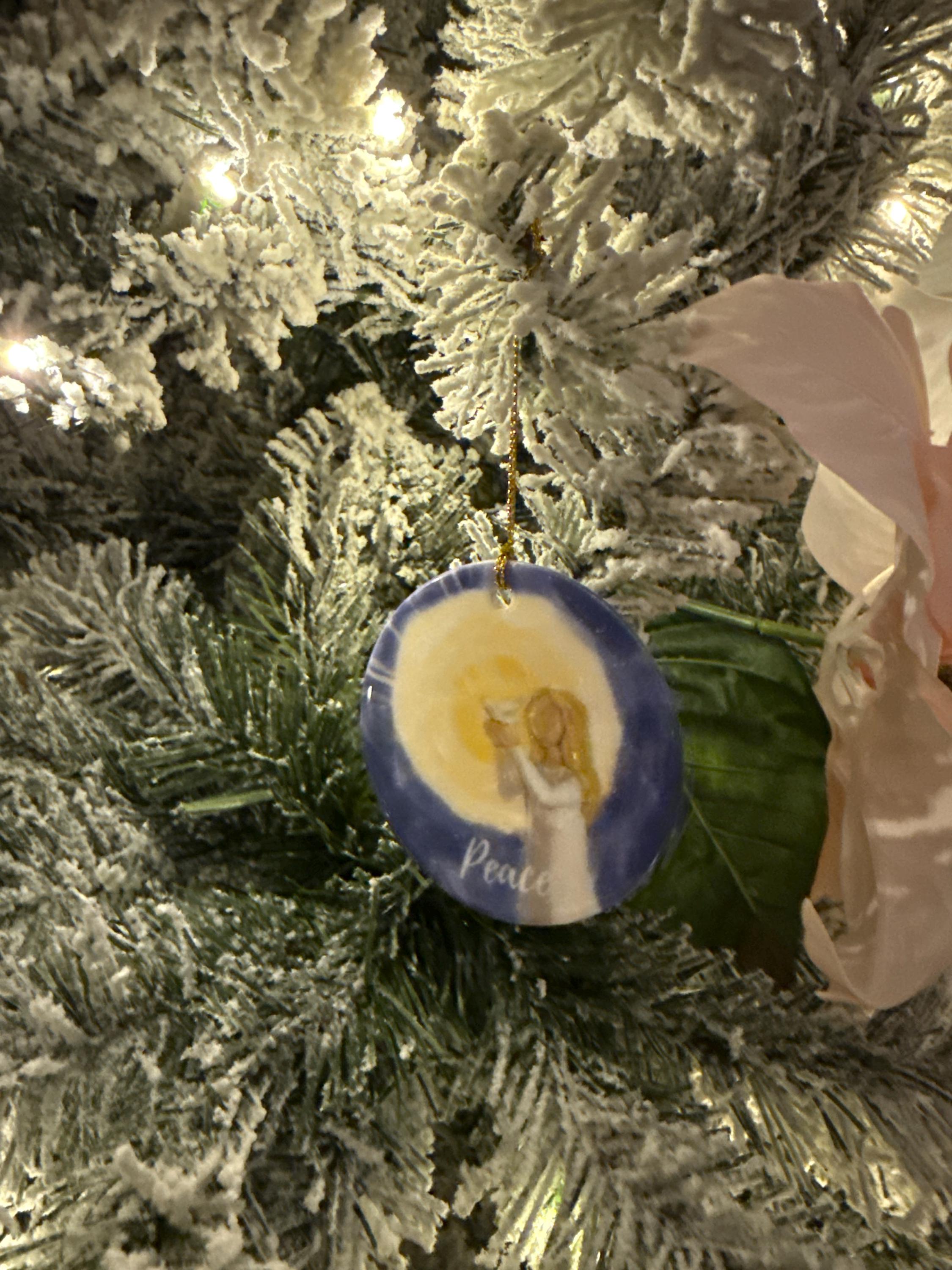 This gentle, painterly angel design is created from an original Stacie Kearns Art painting and professionally sublimated onto a 3-inch round ceramic ornament. The result is a soft, artistic, and heartfelt keepsake meant to bring comfort during the holidays and throughout the year.